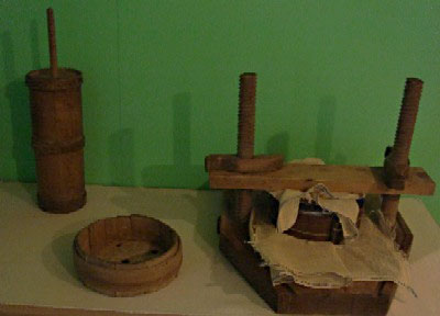 Stossbutterfass Aichnchiblin, Käseform Vättära zum Abtropfen der Käsemasse und Käsepresse mit Käsereif. Die Geräte dienten früher der Milchverarbeitung. Im Sommer erfolgte diese auf der Alp, im Winter im Dorf.