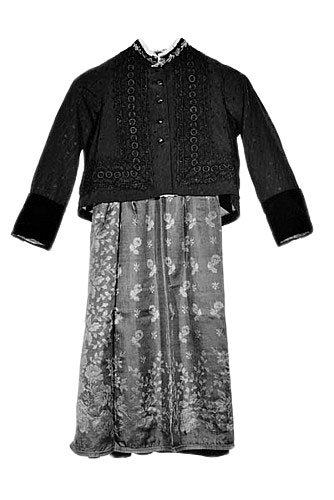 Mädchentracht (Bild ohne Hut), hergestellt 1932 im Lötschental, Rock und Jacke aus schwarzem Seidenstoff, grünviolette Seidenschürze. Die langärmlige, hochgeschlossene Jacke ist mit Garnituren aus Baumwollsamt und Kunstseide verziert und weist einen bestickten Stehkragen aus Samt auf. Sammlung Lötschentaler Museum.