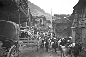 Carl Abächerli (1893-1986): Ziegenherde in der damals noch engen Dorfstrasse von Kippel. Glasplatte aus den Beständen des Staatsarchivs Obwalden.