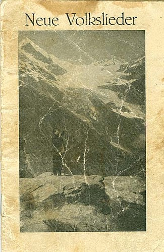 "Neue Volkslieder", gedrucktes Heft mit 13 Volksliedern von Gregor Brantschen, gedruckt in Einsiedeln und herausgegeben 1926 vom Verlag Ad. Sarbach, Randa. Das Titelbild zeigt einen Hirtenknaben mit Trubhorn vor einer Gebirgskulisse. Schenkung Robert Lehner, Ferden.